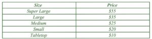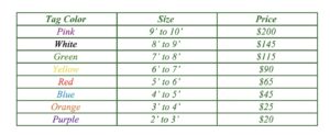 Each tree is marked with a colored ribbon that indicates its size and price. A guide to ribbon colors and their prices is provided below.